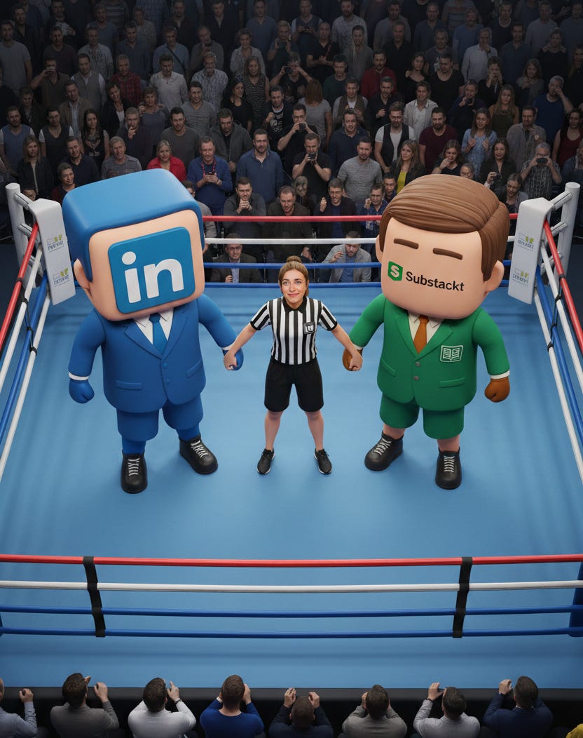 LinkedIn is a “rented” platform for a user (the algorithm can change, reach can drop), while Substack is more like your “property” (you can use the email list you build).